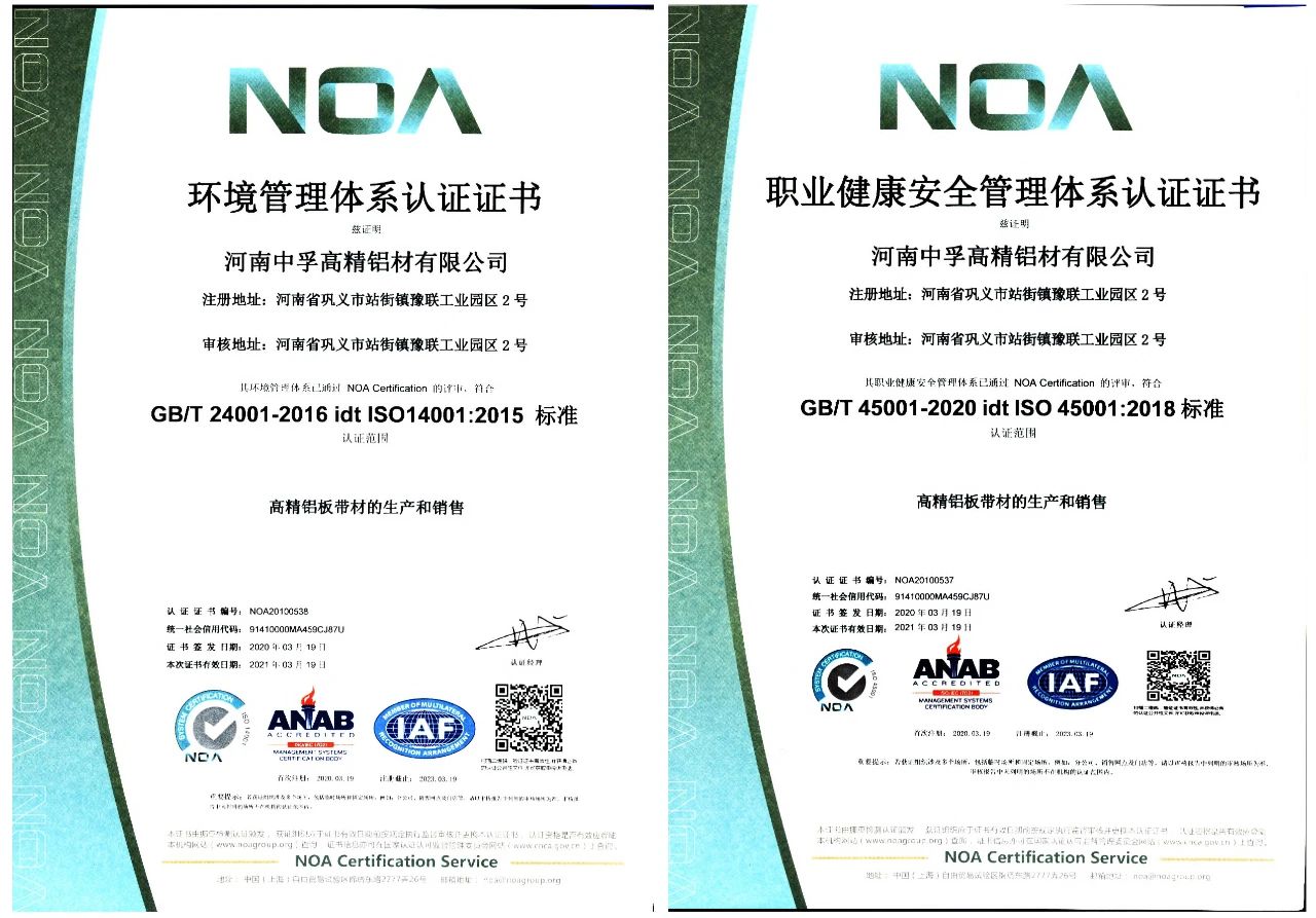 近日,中孚高精铝材公司收到挪亚检测认证机构颁发的《环境管理体系认证证书》和《职业健康安全管理体系认证证书》。《证书》显示,中孚高精铝材公司环境管理体系符合GB/T24001-2016/idt ISO14001:2015标准、职业健康安全管理体系符合GB/T 45001-2020 idt ISO45001:2018标准。