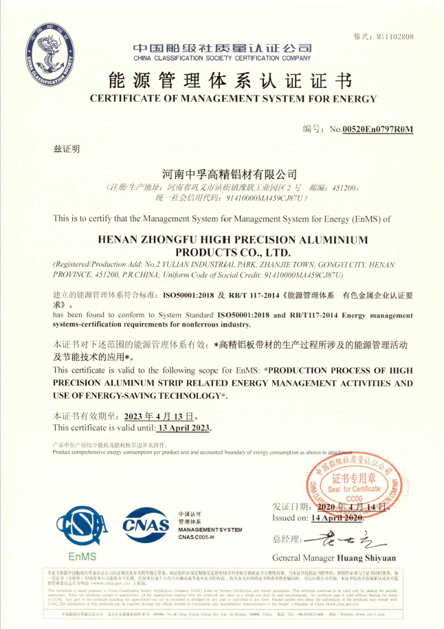 近日,中孚高精铝材公司收到了中国船级社质量认证公司颁发的《能源管理体系认证证书》,标志着公司建立的能源管理体系符合标准ISO50001:2018及RB/T 117-2014《能源管理体系有色金属企业认证要求》。